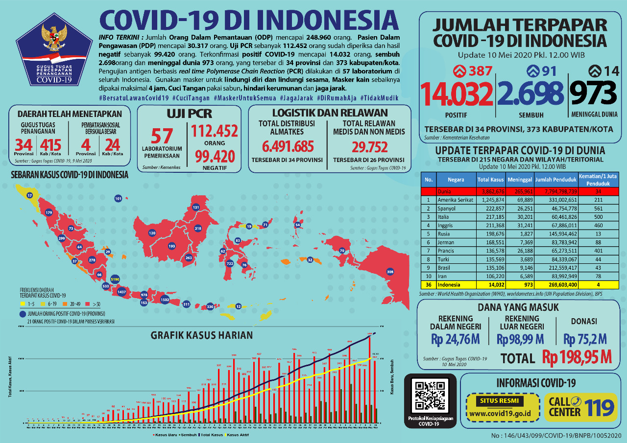 Di sisi lain, jumlah kasus terkonfirmasi positif menjadi 14.032 setelah ada penambahan sebanyak 387 orang. Sedangkan jumlah kasus meninggal yang disebabkan COVID-19 bertambah menjadi 973 setelah ada penambagan sebanyak 14 orang.